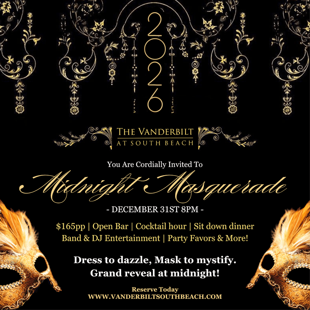On December 31st at 8 PM, step into an enchanting evening of intrigue and elegance at The Vanderbilt at South Beach. Dress to dazzle and don your most captivating mask as you sip, dine, and dance the night away in unforgettable style. Enjoy a lavish cocktail hour ๐ธ, a gourmet sit-down dinner ๐ฝ๏ธ, and a premium open bar ๐ฅ, all set to the lively sounds of our live band and DJ entertainment ๐ถ. Party favors, surprises, and a grand midnight reveal await as you welcome 2026 in spectacular fashion. โจ Dress to dazzle. Mask to mystify. Celebrate the magic of midnight. โจ